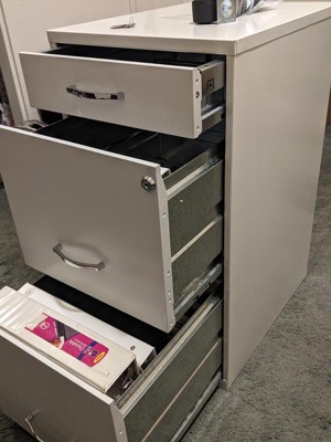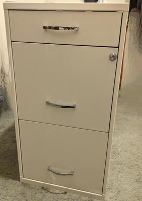 [This review was collected as part of a promotion.] This Space Solutions Cabinet is great! It has three drawers, a small top drawer and two bigger bottom drawers that are easy to open and close and even has a lock for the top and middle drawer so documents stay safe. It is white and is 18 inches in length which makes it the perfect size for smaller areas. The second and third drawers are big enough to put hanging files and it even comes with 4 wheels that can be put on the bottom to easily move it around. This cabiet helps us organize our papers without taking up to much space. I highly recommend!