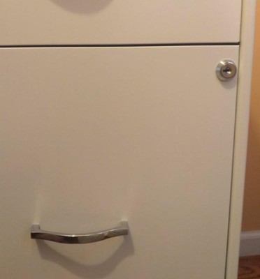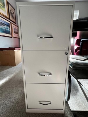 [This review was collected as part of a promotion.] This filing cabinet from Space Solutions is sturdy and spacious. It holds many files and other office stuff. It stands tall and has three drawers. The middle drawer has a lock and comes with two keys. This is great for more important stuff. The handles were easy to put on which was the only thing I had to assemble. Overall, I would definitely recommend this filing cabinet.