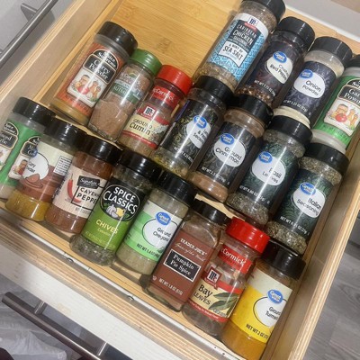 This works great in my drawer and I was so pleased that it fit perfectly and I now have all my spices organized and it looks so nice the quality is amazing. I would definitely recommend purchasing this item! You will love the organization this item helps with that. I love this item because it helps me see all my spices and before they were hard too see. :)
