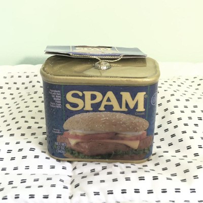 Cute little plastic spam container with a realistic label, we have gotten a lot of laughs and compliments on this one