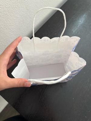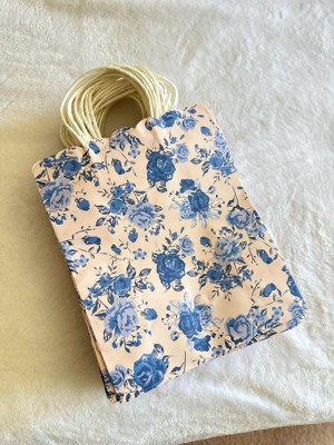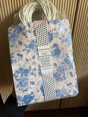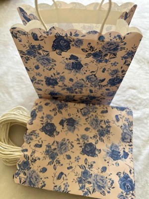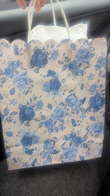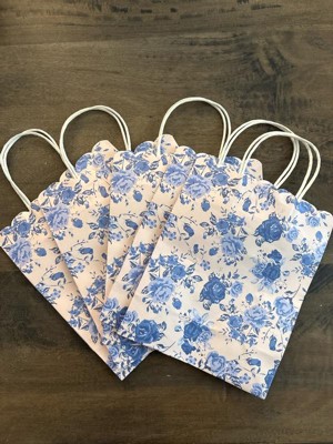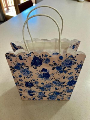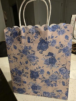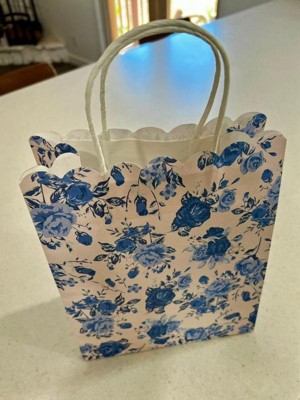 [This review was collected as part of a promotion.] This pack of gift bags is adorable! It features a blue floral print (mostly roses) on a light pink background. The top edges of the bag are scalloped which gives it an elegant feel. The handle seems sturdy, though I have yet to use it for anything particularly heavy. Overall a big win!