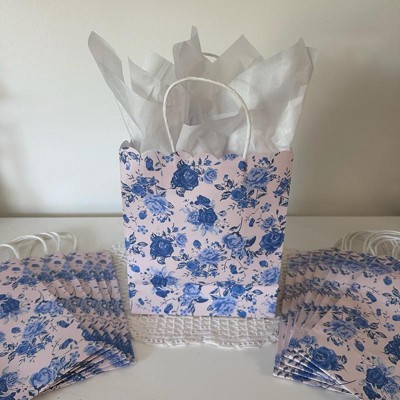 Sparkle and Bash 24 Pack Floral Gift Bags with Handles, Medium Size, Paper Goodie Bag with Blue Rose Flowers for All Occasions, 10x8x4 In