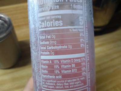 carbonated water, contains 2% or less of: kiwi juice concentrate, strawberry juice concentrate, fruit and vegetable juice (for color), natural flavors, green tea extract, d-alpha-tocopherol acetate (vitamin e), niacinamide (vitamin b3), calcium pantothenate (vitamin b5), pyridoxine hydrochloride (vitamin b6), biotin, cyanocobalamin (vitamin b12), sucralose, citric acid, gum arabic, ester gum, potassium benzoate (to ensure freshness).