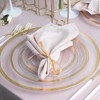 These clear disposable plates set with gold rim will add a luxurious look to your table. Our set of gold rimmed plastic plates includes three sizes plates and can brighten your guest's eyes and leave a deep impression on them.