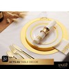 The SparkSettings premium disposable plates for party set comes in a timeless white color and features an elegant gold rim that makes them an undeniably stunning addition to any dining table, catering or buffet. The set includes 50 x 10.25 inches plastic dinner plates and 50 x 7.5 inches appetizer plates for the main course, appetizers, salads and desserts.