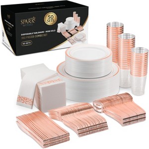 The stunning SparkSettings disposable plastic dinnerware set will equip you with everything you need to set the most attractive tables for you and your guests. The complete bundle includes: 50 x 10.25” rose gold rimmed plastic dinner plates, 50 x 7.5” rose gold rimmed plastic dessert plates, 50 rose gold rim cups, 50 napkins with gorgeous designs, 50 rose gold forks, 50 rose gold spoons and 50 rose gold knives.