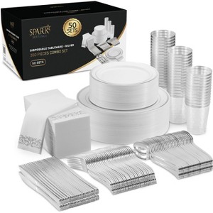 The stunning SparkSettings disposable plastic dinnerware set will equip you with everything you need to set the most attractive tables for you and your guests. The complete bundle includes: 50 x 10.25” silver rimmed plastic dinner plates, 50 x 7.5” silver rimmed plastic dessert plates, 50 silver rim cups, 50 napkins with gorgeous designs, 50 silver forks, 50 silver spoons and 50 silver knives.