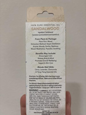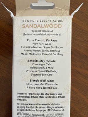 I love this sandalwood essential oil. The scent is a nice, warm and cozy scent. The scent was not overpowering but still added a nice subtle scent to the room. The container is .25 ounces but a little bit goes a long way. I only needed three drops and the room smelled great.