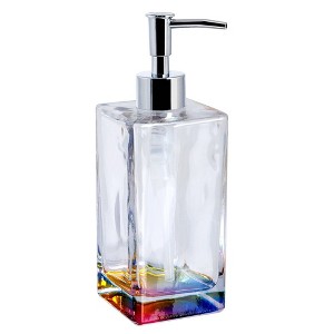 The sleek and sophisticated styling of the Spectrum Soap/Lotion Pump by Allure Home Creation is a perfect addition to your contemporary bathroom. This chunky angled dispenser, made of clear glass with a hand-painted base, gives off an iridescent rainbow effect as light touches it. It is complemented with a removable plastic pump in a shiny chrome finish. Fill with your favorite liquid soap or lotion and push down on the pump to easily dispense just the right amount into the palm of your hand. Dress your countertop with this eye-catching piece that will make your room sparkle. Use alone or coordinate with other matching pieces in the Spectrum Bath Collection. Hand Wash, Spot or Wipe Clean.