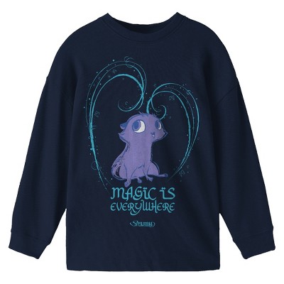 Bring enchanting magic to her wardrobe with this youth girl's royal blue Spellbound long sleeve hooded sweatshirt. Featuring Elian, the Oracle of the Moon, and the Oracle of the Sun above white "Magic Is Everywhere" lettering, this hoodie sparks imagination and wonder. It includes a cozy double-lined hood and is crafted from a soft cotton and polyester blend. For simple maintenance, machine wash it on cold with like colors and tumble dry low heat.