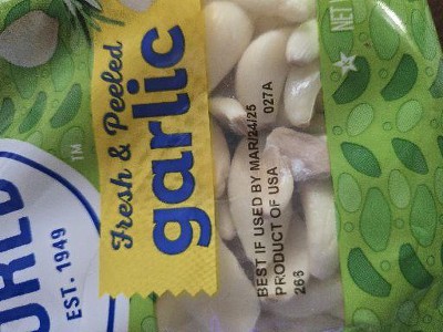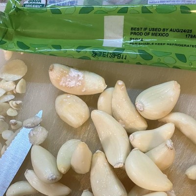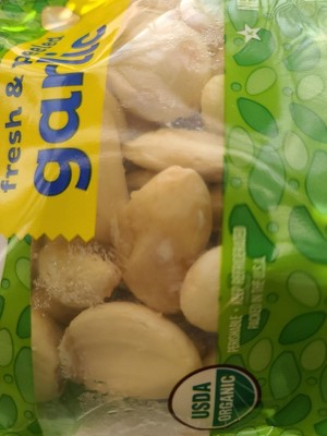A: Our peeled organic garlic is grown either in: Argentina, Spain, Mexico or the US depending on the season. This will ink jetted on the bag.