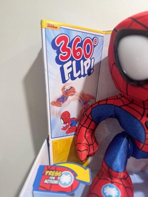 [This review was collected as part of a promotion.] Spidey actually flips! He doesn't land perfect every time but most of the time. It also shoots webs from its wrists! The doll has some good catch phrases. I would recommend this to anyone.