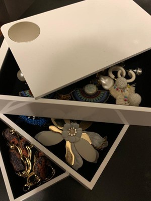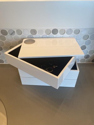 [This review was collected as part of a promotion.] I love this jewelry box. It’s beautiful, stylish and functional. I love it’s simple and modern design with white glossy finish and silver accent. Looks perfect on my nightstand. Jewelry box is pretty roomy, drawers open and close very smoothly. Also drawers lined with soft fabric to prevent jewelry from moving. I keep all my every day jewelry in this beautiful box. Definitely recommend.