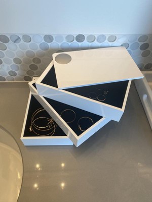 [This review was collected as part of a promotion.] This is a great storage jewelry box for my daughters necklaces, rings, and bracelets. It is small enough that it doesn’t take up a lot of space on her dresser. The white color goes with any decor and it seems really durable. I really like the sleek design and how the drawers swivel open. Overall this is a great jewelry box and will be used for years to come.