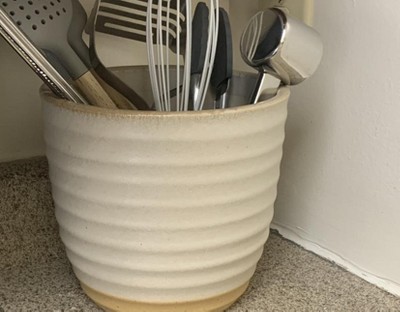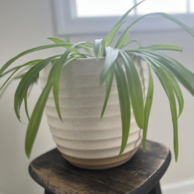 A: The planter pot has a ribbed pattern with a split-glaze finish, giving it a rustic look.