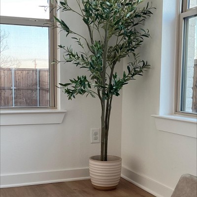 A: Hello Linda - We appreciate your interest in this item. The 10.2" Threshold Split Glaze Planter (actual size 7.48"H x 8.15"W) is better suited for smaller plants or shrubs, rather than a full-sized 5-foot tree. Happy shopping at Target. – Alvin