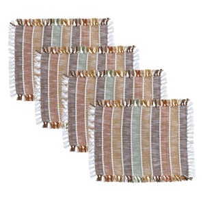 Create a captivating tablescape featuring a timeless, classic pattern delightfully detailed on this boho placemat set of four. The stripe design on these reusable dinner mats effortlessly combines a warm earthy color palette of orange, brown, and green with a textured surface brought by the stripes of thickly braided rich red yarn and a unique tassel fringe border. Adds interest and dimension, providing a versatile tabletop addition to introduce in cozy bohemian table decor or autumn dining room decoration. Constructed of a high-quality cotton material that effortlessly combines aesthetic appeal with functionality by offering an absorbent protective surface that will help block potential scuffs or spillages from leaving lasting impacts on your tabletop surface.