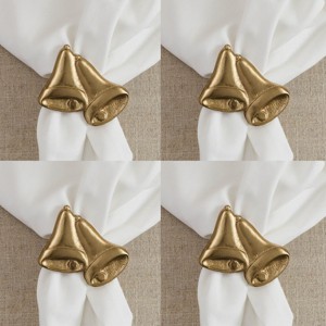 Elevate your holiday dining room decor with this set of four stylish metal napkin rings, blending functionality with chic charm. These golden napkin rings showcase a minimalist yet contemporary look, featuring classic bells that add a touch of festivity to your seasonal or everyday table setting while also organizing cloth napkins for formal occasions and casual everyday meals. Made of premium metal construction for a long-lasting tabletop accent, easy to slide onto folded cloth napkins to securely hold them in place. Whether decorating for a formal holiday dinner or a casual family meal, these Christmas napkin rings establish a warm and inviting atmosphere to make every meal feel special.