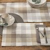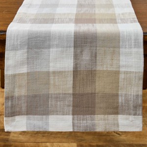 Embrace cozy character and comfortable neutrals with this classic patterned table runner. Intricately crafted in a timeless plaid design of subtle tan, beige, and white hues that brings a relaxing touch of versatile warmth to your dinner centerpiece space. Offers a stylish tabletop accessory to use time and time again in your favorite country chic, minimalistic, traditional, or rustic farmhouse dining room decor. The durable cotton blend construction provides a protective barrier to a tabletop surface from potential spills and messes created during casual or formal meals.