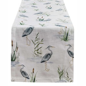 Subtle with a seaside touch, this patterned table runner introduces a calm and refreshing element to any dining space from its serene print. The delicate design features beautiful blue herons perched along a coastal wetland inspired scene with cattails and other beachy greenery. This decorative dinner mat elegantly elevates a casual or formal dinner arrangement to place as a beautiful centerpiece base. Constructed of a high quality cotton material that effortlessly combines aesthetic appeal with functionality by offering an absorbent protective surface that will help block potential scuffs or spillages from leaving lasting impacts on your tabletop surface. Perfect to pair with cozy condo, beach house, nautical, lake house, vacation home, or coastal chic decor!