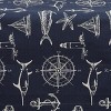 Complete with coastal charm, this nautical table runner features a detailed traditional seaside design of classic oceanic elements. Sailboats, anchors, marlin fish, and compasses are highlighted in white against a navy blue fabric ground. The calming, cozy colorway and beautiful beach details provide a decorative tabletop mat great for adding a fresh and casual feel to your home space. Soft and absorbent to the touch, this reusable table topper mat is constructed of premium cotton material well-suited for both everyday and special occasion meals. Utilize this kitchen textile accent on its own as a charming centerpiece backdrop or create a wonderful dinner arrangement with various decorative table accents that will elegantly elevate summer, tropical, lake house, antique nautical table decorations, and more.