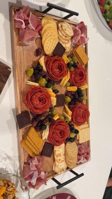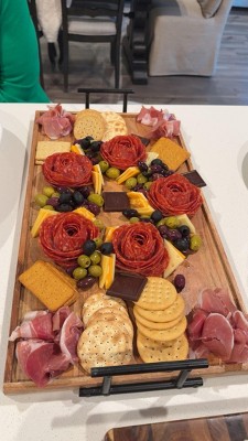 - This urban style charcuterie board measures 21.75 inches width by 12 inches length. The raised edges keeps hors d'oeuvres, appetizers, and other snacks in place to decrease the chance of any spillage.