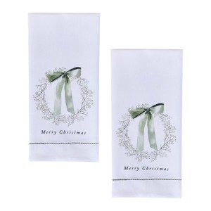 Bring a sense of warmth and coziness to any holiday decorations with this set of two nature seasonal dishtowels. Illustrates a detailed botanical print featuring a mistletoe wreath topped with a sage green bow. The dainty design is beautifully accented by a stitched green stripe thread and 'Merry Christmas' in italics. Complete a Christmas gift or add in your own holiday kitchen decorations for a fun, festive twist! Crafted from soft cotton material, these winter dish towels provide a functional and stylish tool to utilize during everyday kitchen tasks. Easy to display on an oven handle or on a wall hook using the sewn-in tab. Perfect to amplify any winter farmhouse, seasonal primitive, cozy Christmas, rustic holiday decorations, and more.