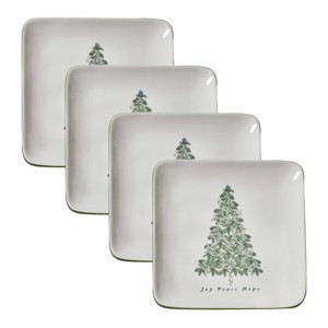 Festive florals meet subtle, seasonal beauty with this set of four nature seasonal salad plates! Features a charming design of a mistletoe tree with the phrases, 'Joy Peace Hope,' and a delicate green border. The square dolomite dishes add both functionality and aesthetic appeal to holiday meals and seasonal dinner gatherings. Provides a decorative display to utilize when serving appetizers, salad, desserts, snacks, and more! When not in use for winter table settings and holiday decorations, these Christmas appetizer plates can be stacked for quick and easy storage. Perfect to amplify any winter farmhouse, seasonal primitive, cozy Christmas, rustic holiday table decorations, and more.