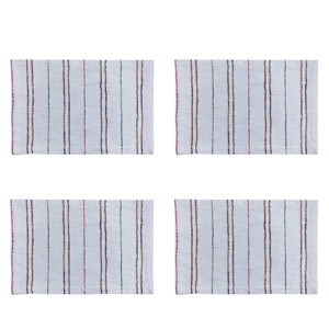 Add depth and visual interest to your holiday dining room decor with this set of four textured placemats. Features subtle threaded stripes in festive hues of red and green highlighted against a crisp white background that provides a versatile addition to create a comforting year-round or Christmas dining room decoration. Functional and aesthetic details perfect to elevate a casual or formal dinner arrangement to showcase beautiful tableware including dinner plates, cutlery, and glassware. These dinner mats are durably woven on premium cotton slub fabric with an absorbent protective surface that will help block potential scuffs or spillages from leaving lasting impacts on your tabletop surface.