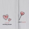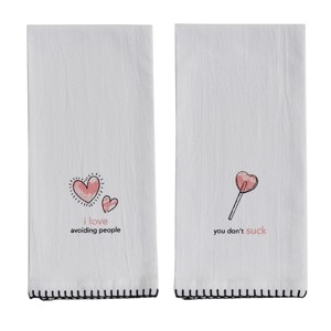 A twist on the traditional season of love vibes with these fun subtle Valentines Day dishtowels. This bundle includes two decorative tea towels, both crafted from 100% premium cotton perfect for a lovely seasonal accent or funny Galentines Day gift set. One towel features two pink hearts paired by a funny printed phrase, 'I love avoiding people,' and a trendy flair consisting of black trim stitching. The other towel includes a printed heart shape lollipop accompanied by a humorous pun. Perfect for gifting to anyone in need of a cheerful and comical take on Valentine's Day.
