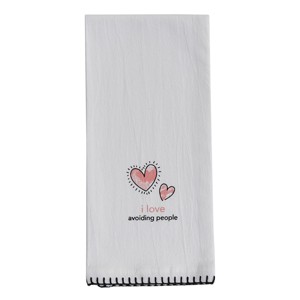 Funny anti-Valentine's Day dishtowel for the introverts. Features a pair of two pink hearts accompanied by a 'I love avoiding people' humorous phrase and a trendy flair consisting of black trim stitching. Perfect for gifting to anyone in need of a cheerful and comical take on Valentine's Day. This charming kitchen essential is made of 100% premium cotton to add a durable and soft touch to an interior setting.