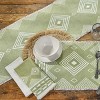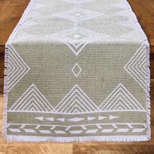 Display a delightful design to add interest and dimension to any dining setting. This textured table runner features a diamond geometric pattern printed in white against a soothing sage green braided base with a decorative fringe border. Made of tightly woven material for a protective barrier to a tabletop surface from potential spills and messes created during casual or formal meals. Functional and aesthetically pleasing to elevate seasonal or everyday dinner arrangements to showcase beautiful tableware including dinner plates, cutlery, and glassware. Offers a convenient tabletop addition to be used time and time again in your favorite country chic, coastal, farmhouse, eclectic, or bohemian dining room decor.