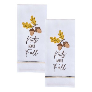 Embrace the essence of fall with this seasonal decorative dishtowel set of two! Embroidered with a humorous saying, 'Nuts about fall,' and a bundle of acorns. Complete a housewarming gift or add in your own fall kitchen decorations for a fun, festive twist! Crafted from soft cotton material, these rustic dish towels provide a functional and stylish tool to utilize during everyday kitchen tasks. Simple to display on an oven handle or on a wall hook using the sewn-in tab, perfect for easy hanging. Perfect to amplify any fall farmhouse, seasonal primitive, cozy harvest, rustic autumn decorations, and more.