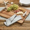 Complete with coastal charm, this wooden charcuterie board adds a subtle seaside touch to complement any nautical kitchen decor. Intricately crafted with durable wood construction in a thick and thin horizontal stripe design that closely resembles boat deck flooring. Includes two convenient metal handles styled like a boat cleat for a touch of marine inspired appeal during special events, parties, and family gatherings. Sized for versatility, this rectangle charcuterie board provides ample space for serving cheese, appetizers, and other snack arrangements.