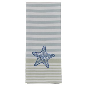 Mealtime preparation and cleanup is made stylishly easy with this woven dishtowel with starfish motif. Features an embroidered starfish and versatile stripe design in green and blue hues perfect for gifting, or an attractive addition to your own decor. Made from high quality and ultra-absorbent cotton, this eye-catching coastal tea towel will add warmth and comfort to your kitchen, while providing a very useful tool for drying dishes or protecting hands from hot dishes.