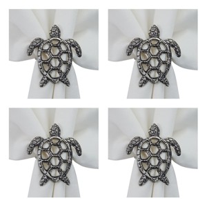 Complete with coastal charm, this set of four silver aquatic napkin rings add a subtle seaside touch to complement any nautical kitchen decor. Dress up your table setting with timeless elegance from the addition these metal napkins rings. Charmingly combines a sea turtle shape with intricate geometric cutout design and shiny metallic silver finish for a bold yet refined detail that is eye-catching for both everyday or special occasion meals. Whether decorating for a formal party dinner or a casual family gathering, these decorative table accessories will make every meal feel special. The timeless design allows this serviette holder bundle to be used in your desired summer, beach house, contemporary coastal table decor, and more. Provides an easy and cost effective way to change up the look and feel of your existing dining space.