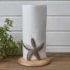 Create a completely coastal style in your summer kitchen decor with the addition of this nautical standing paper towel holder. Incorporates a natural element from the vertical wooden stand with a fun chic seaside accent that is stylishly captured by the shiny silver starfish figure. The stunning starfish not only adds visual appeal, but also offers a functional aspect by preventing the paper towel roll from unraveling and provides a spot to tear a sheet off with ease. Trouble-free design that allows for easy removal to add a new paper towel roll by simply sliding it through the vertical pole from the top.