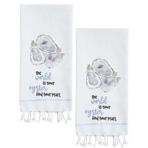 Complete with coastal charm, this bundle includes a set of two sentimental dishtowels. These nautical decorative tea towels feature a printed design of watercolor oysters intricately stitched with a motivational quote, 'The world is your oyster, find your pearl,' with fun tassels at the end. Constructed of premium cotton material for an absorbent and durable kitchen must-have with aesthetic visual appeal. Easy to display on a decorative wall hook with the included hanging tab or drape on an oven handle, kitchen sink space, and bathroom setting. Perfect for an amusing kitchen accent in summer and beach decor or a thoughtful new homeowner gift set!