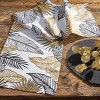Complete with contemporary chic charm! Full of fun foliage, gorgeous golds highlight against the neutral black and white background with a printed design of ferns and tropical plants. Soft and absorbent to the touch, this reusable table topper is constructed of premium cotton material with seamless mitered corners that makes it well-suited to both every day and special occasion meals. Utilize this patterned kitchen textile accent on its own as a centerpiece or create a wonderful dinner arrangement with various decorative table accents that will elegantly elevate bohemian, contemporary, chic, jungle, safari, or tropical table decor.