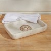 Keep your beauty essentials organized and tidy with the Zuri Bath Tray. Designed in a natural-colored soapstone and showcasing a decorative printed medallion design in a metallic gold finish, this vanity tray brings a touch of artistic flair to your bathroom decor. Designed with raised edges along with rounded corners, the tray prevents small beauty items from coming in contact with wet countertops and adds gorgeous style to your bathroom countertop.