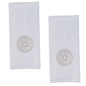 Experience the ultimate combination of comfort and luxury with our set of two plush terry fingertip towels. Introducing classic elegance in neutral hues, an embroidered geometric medallion in a warm mushroom taupe thread highlights against the crisp white background for a touch of contemporary charm to amplify your modern boho bathroom decor. Whether displayed on a bathroom towel rack or draped along a kitchen sink cabinet, these cotton towels offer the perfect combination of comfort and functionality. Crafted from premium-quality materials, these thick towels are designed to provide superior softness, absorbency, and durability for everyday use.