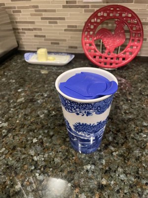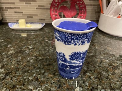 Product Name: Spode Blue Italian 8oz Porcelain Travel Mug with Lid – Scenic Patterned Drinkware with Decorative Border - Portable Ceramic Coffee Cup