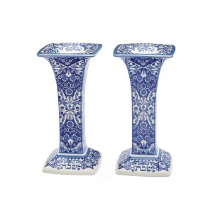 Product Name: Spode Judaica Sabbath Candlesticks, Set of 2 - Elegant Blue & White Ceramic Candle Holders Featuring Star of David & Floral Motifs - Fine Porcelain
