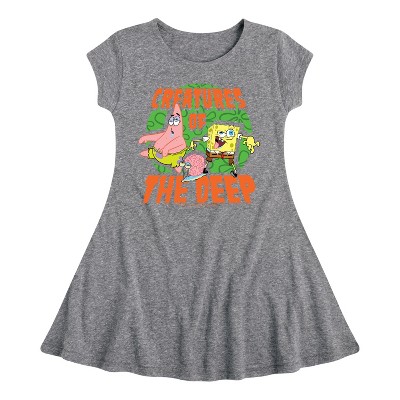 SpongeBob SquarePants - Creatures Of The Deep - Toddler and Youth Girls A-line Dress - Dive into the fun of Bikini Bottom with SpongeBob SquarePants graphic apparel! Featuring colorful designs of SpongeBob, Patrick, Squidward, Sandy, and more, this collection brings the show's quirky humor and unforgettable moments to life. Perfect for fans of all ages, these pieces add a splash of personality to any wardrobe.