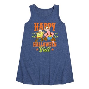 SpongeBob SquarePants - Happy Halloween Y'all - Girls Aline Dress - Dive into the fun of Bikini Bottom with SpongeBob SquarePants graphic apparel! Featuring colorful designs of SpongeBob, Patrick, Squidward, Sandy, and more, this collection brings the show's quirky humor and unforgettable moments to life. Perfect for fans of all ages, these pieces add a splash of personality to any wardrobe.