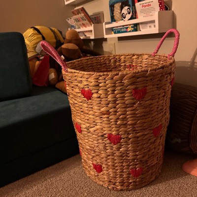 [This review was collected as part of a promotion.] I purchased this adorable heart patterned floor basket & it looked great in my daughters bedroom! This is a beautifully woven basket 18.5 inches (H); x 15 inches (W); 15 inches (D). It was tall & skinny enough to fit next to her drawer. This would be functional for anything like toys or even a dirty clothes basket in her bathroom. Love the handles too for easy pick up. This basket it really well made! Highly recommend if you’re looking for something to store items & keep clutter away in kids room.