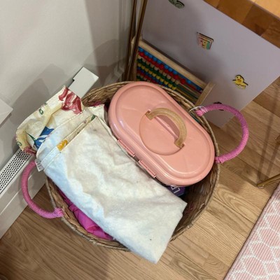 [This review was collected as part of a promotion.] This is a great toy basket! The pink handles are sturdy so I can pull it in and out of our playpen. My baby loves to stand and pull out toys or we flip it on it’s side and she pulls everything out. It holds so much! I originally thought I would need to order two but I’m glad I waited because this basket holds so much! The pink flowers on the basket are a cute detail.