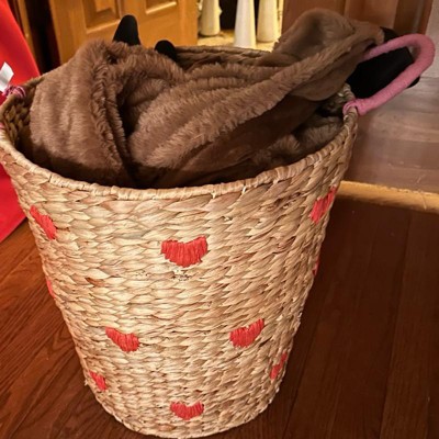 [This review was collected as part of a promotion.] I ordered this heart design basket for storing blankets in the living room. I was able to fit three throw blankets rolled up into the basket, so I’d say it’s a pretty good size. I could see this being a functional basket for a little girls room to hold stuffed animals. The little hearts on the outside are cute, but just seem to be wrapped onto the weave basket and then tied in a knot on the inside. My main issue is the quality of the basket structure. It was very easy to rub the outside of the basket and it would start to fall apart and just disintegrate.