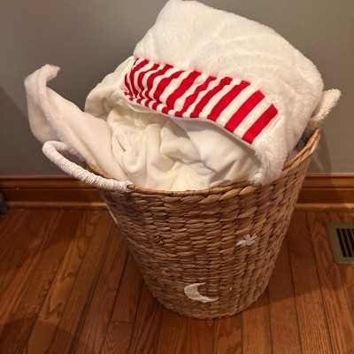 [This review was collected as part of a promotion.] This basket looks cute online but in person the design looks a bit less polished and too spread out on the basket. The basket itself is a nice size for kids items like blankets, toy cars, or stuffed animals. However it feels thin and flimsy and I have concerns about how long it will last with my kids using it for storage. It could work better as a hamper in an older child’s room.