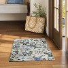 A: The rug features a fresh floral pattern in green and blue, adding a cheerful touch to any room.